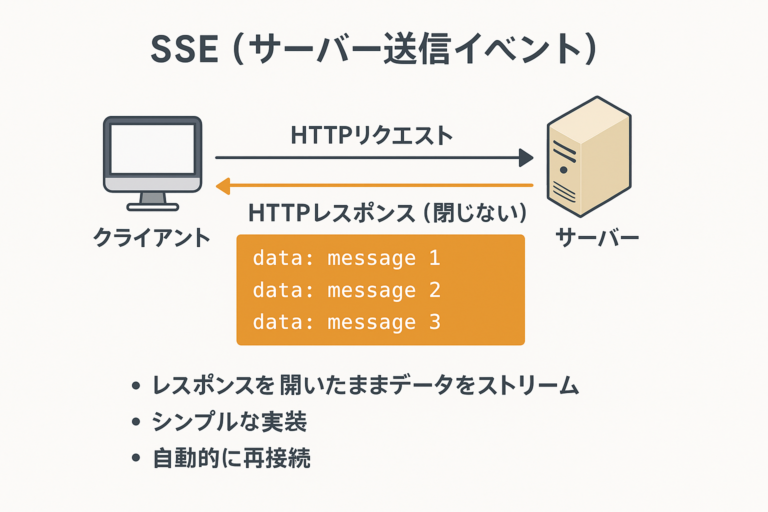 - SSE:サーバー → クライアントの一方向通信(クライアントから送信するのは初回リクエストのみ)