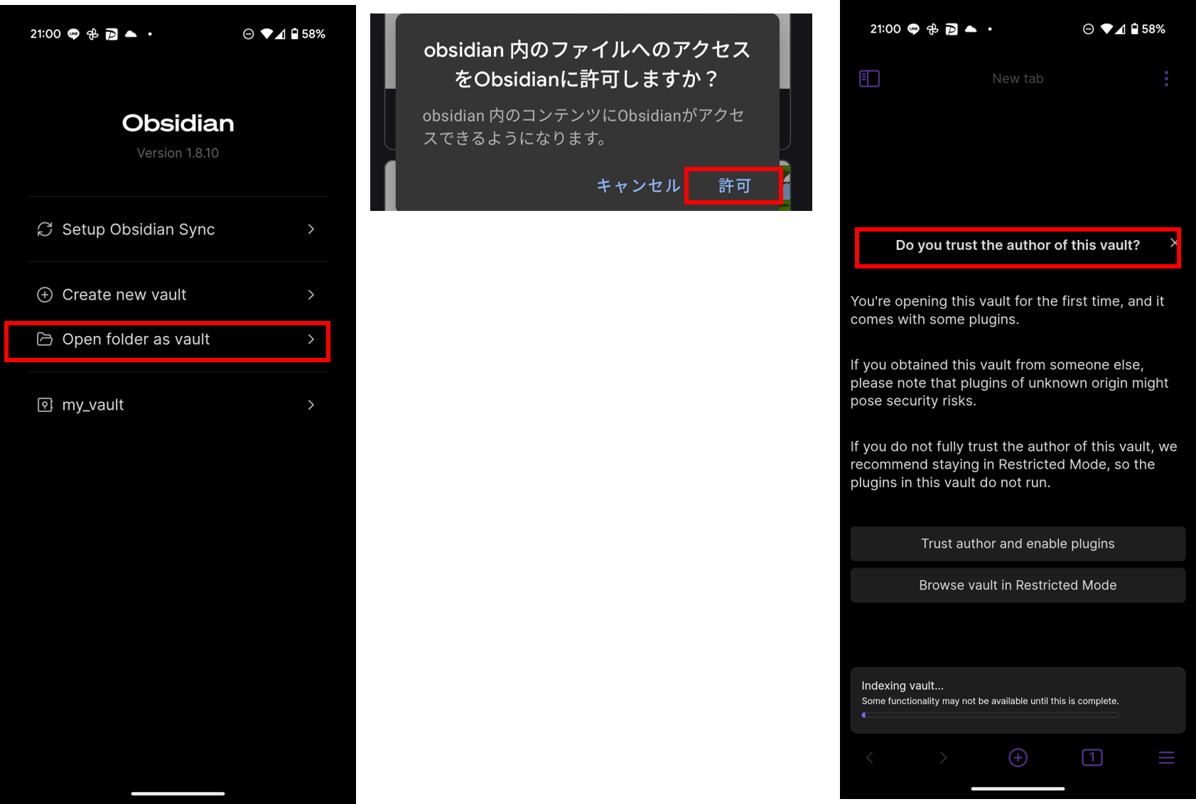 Windowsと同様にObsidianにクローンしたリポジトリを取り込みます。